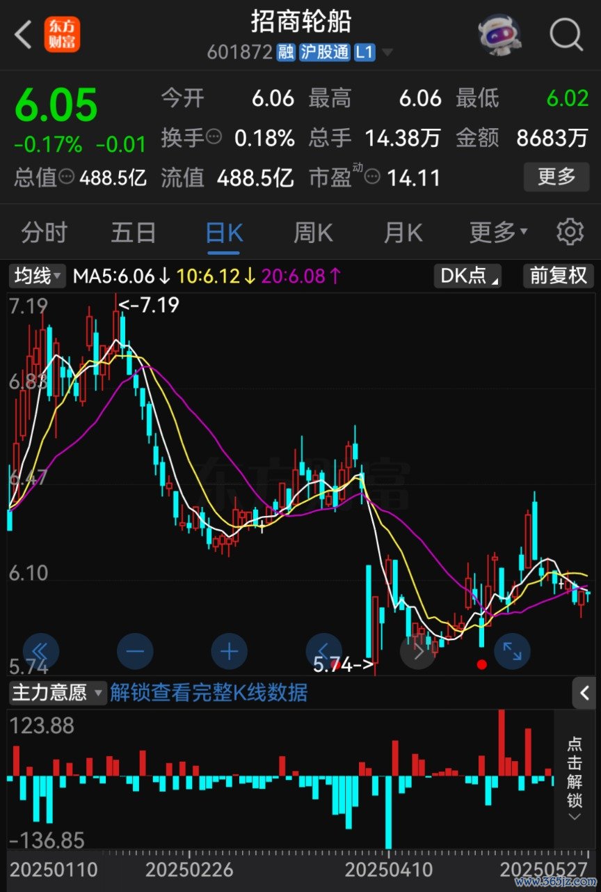 截至5月27日收盘,招商轮船股价报6.05元/股股票在线配资,总市值为488.5亿元。