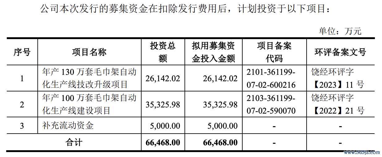 艾芬达表示,公司本次融资的募集资金主要用于“年产130万套毛巾架自动化生产线技改升级项目”“年产100万套毛巾架自动化生产线建设项目”以及“补充流动资金”,募集资金投资项目系基于公司的基本情况以及业务发展和市场需求而制定,有利于提升公司的核心竞争力,扩大业务规模,增强持续经营能力。