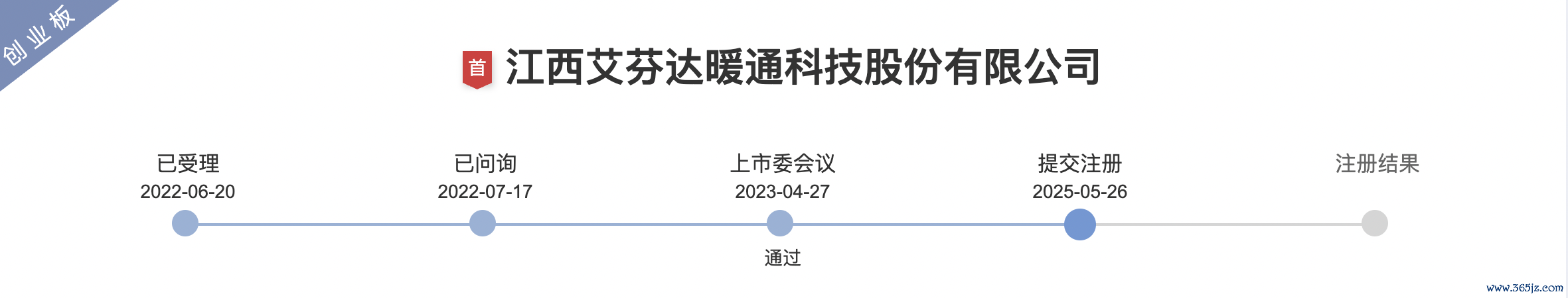 过会两年后,江西艾芬达暖通科技股份有限公司(简称“艾芬达”)终于在5月26日提交注册。