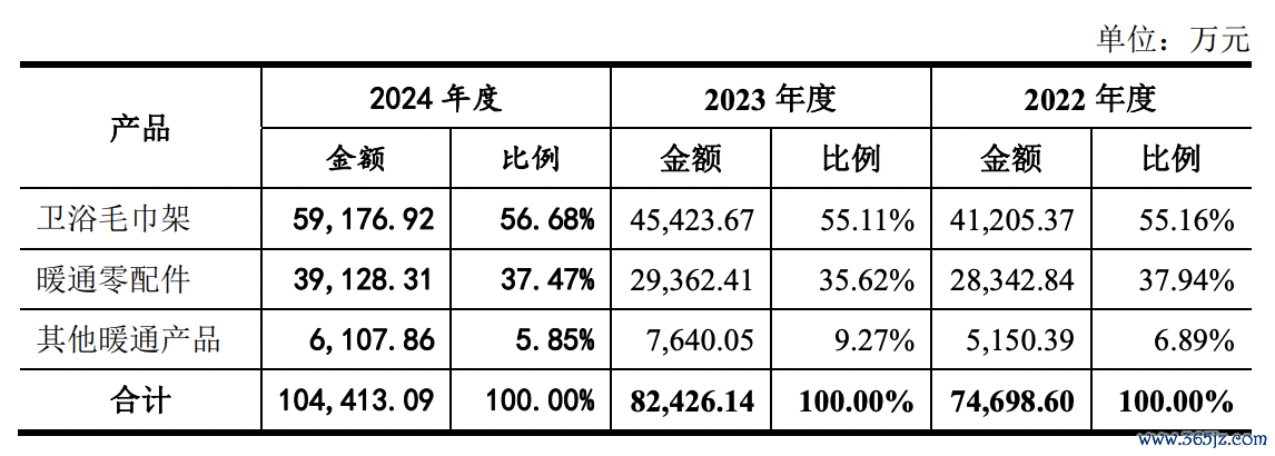 2022年、2023年及2024年(以下简称“报告期”),艾芬达营业收入分别为7.62亿元、8.30亿元和10.50亿元,主要来自于卫浴毛巾架和暖通零配件两大系列产品。净利润分别为9,311.01万元、1.64亿元、1.18亿元。